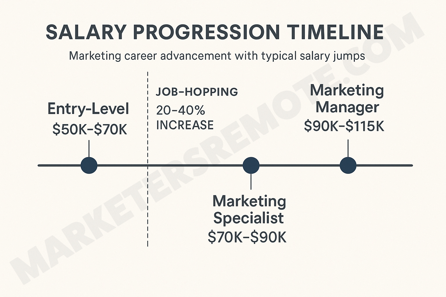 See the timeline below for a typical marketing salary progression and key milestones: